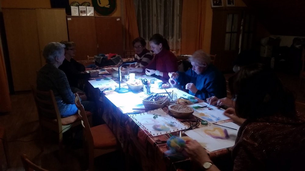 "Setkáváme se v Drážkově u Kamýka nad Vltavou jednou za tři neděle s místními stařenkami, které bydlí v odlehlém kraji a nemají moc možností se setkávat. Obec nám dala k dispozici místnost divadelního spolku. Cvičíme s nimi terapeutická eurytmická cvičení, zpíváme, hrajeme na muzikoterapeutické nástroje, vyprávíme o ročních svátcích, řemeslech, vyrábíme z ovčí vlny, plstíme apod."